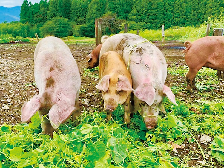 標高700m超の朝霧高原。放牧豚は澄んだ空気を吸い、富士山伏流水の水源が近いおいしい水を飲んで育ちます。土を掘り起こし植物を食べたり自然と関わりながらストレスなく成長する、ストレスフリーの放牧飼育です。