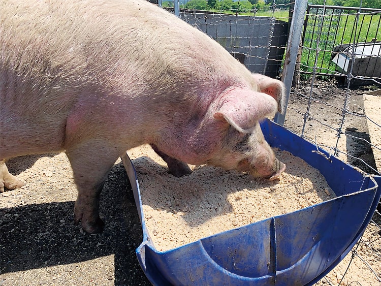 質のよい飼料が美味しい豚を育てます。当社ではエコフィードに様々な発酵菌を加え、自家配合飼料を手作りしています。地域の食品加工場から出るサツマイモ・落花生・おからなど、人が食べるための原料で出来ているエコフィードは、動物飼料の原料より厳しい基準をクリアしており、フードロスの削減にも貢献しています。
